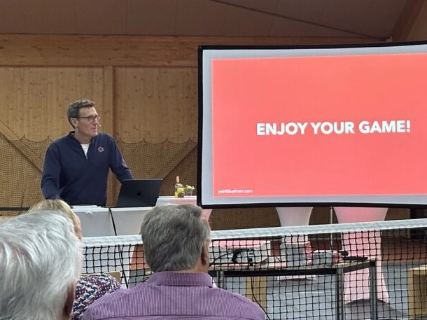 Im letztem Programmpunkt stellte Patrik Kühnen sein Buch vor. Sein Ansatz im Tennis ist nicht „Winning ugly“, ,sondern „Enjoy your game“. Er legt den Focus auf den Ball und das Spiel. „Where focus goes, energy flows“ – jeder Gedanke außerhalb des Matches, jeder Einfluss von Aussen verschlechtert die Chance des Spielers zu gewinnen.